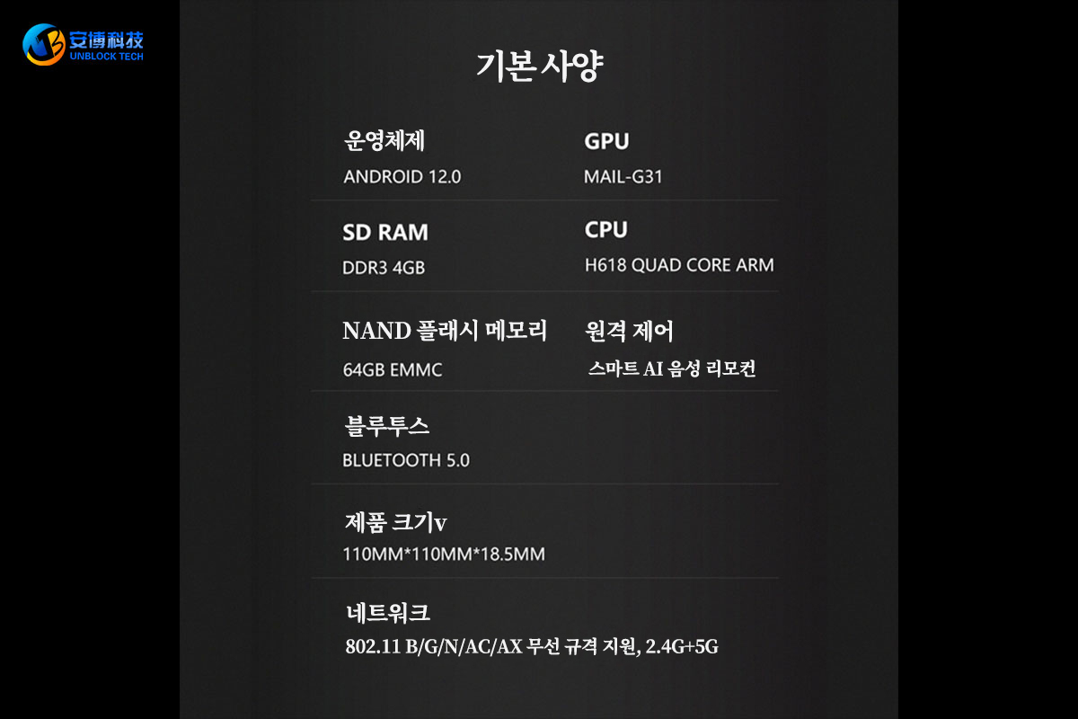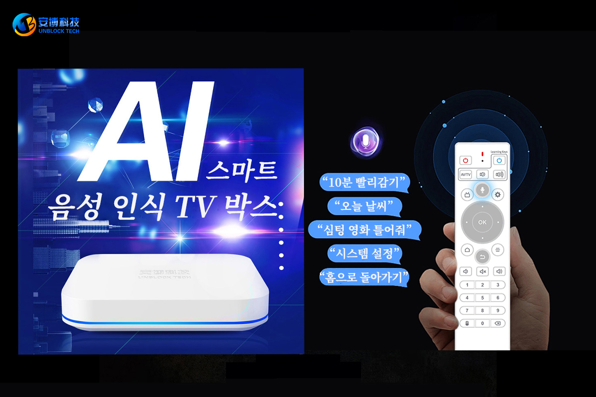 Unblock Tech UBox12A 안드로이드 미디어 플레이어는 AI 스마트 음성 제어 기능을 탑재하여 누구나 쉽게 사용할 수 있습니다.