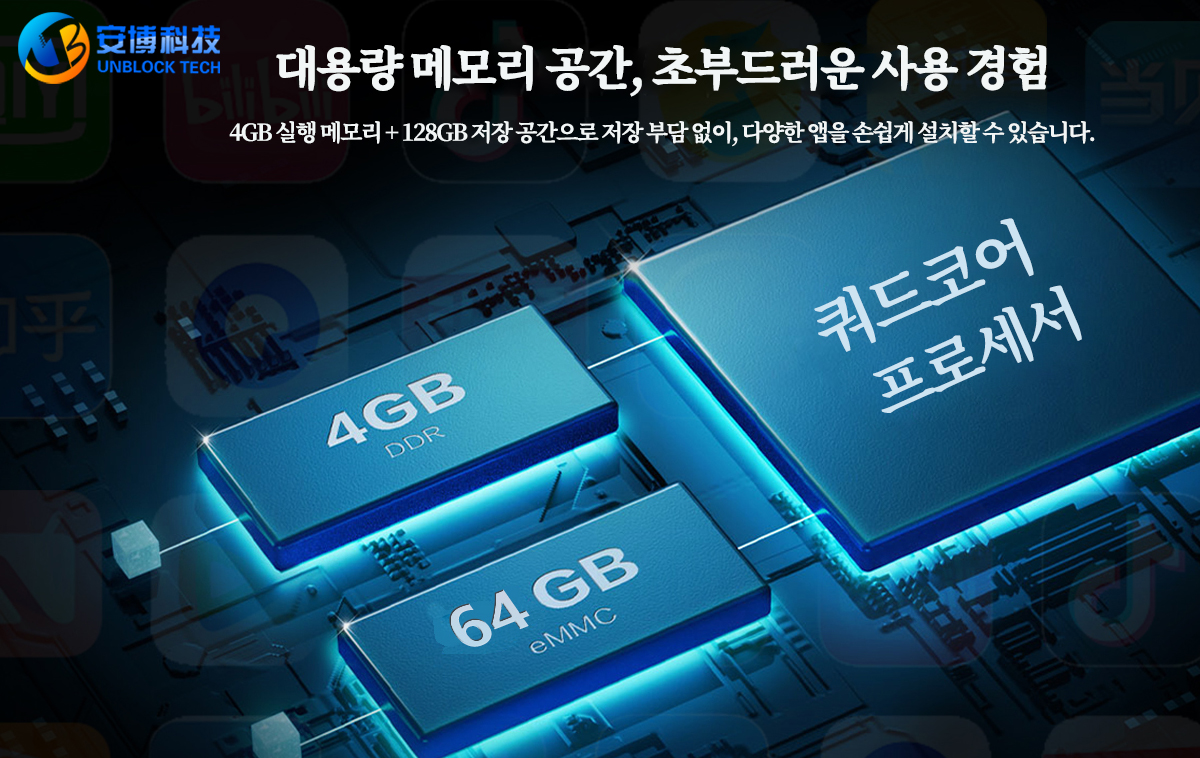 Unblock Tech UBox12 안드로이드 스마트 TV 박스는 4GB의 대용량 RAM과 128GB의 저장 공간을 자랑하여 앱 설치에 제한이 없습니다.