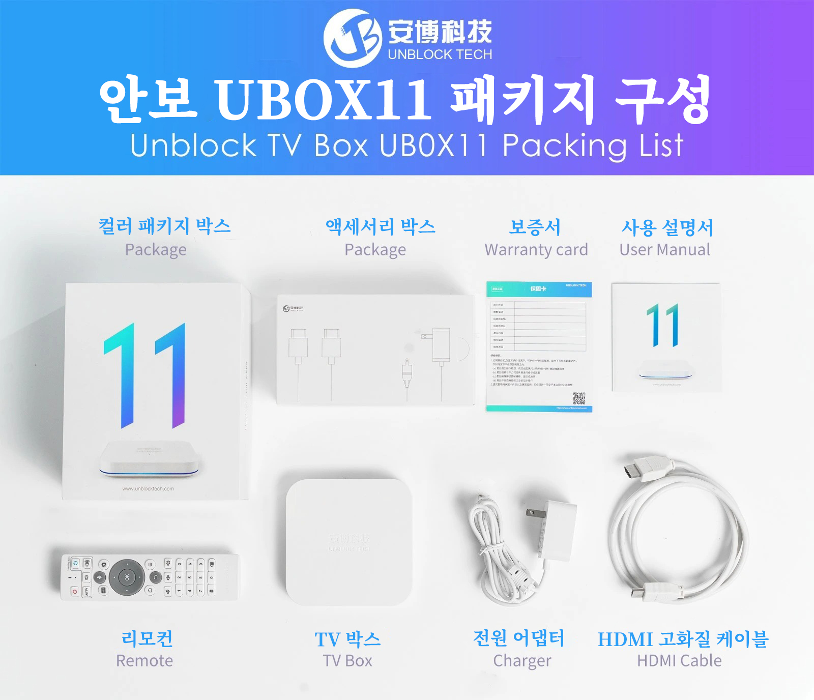 Unblock Tech UBox12에는 HDMI 케이블, 전원 어댑터(미국/영국/유럽/호주), 음성 리모컨, 사용 설명서 및 향상된 사용 경험을 위한 무료 무선 키보드가 포함되어 있습니다.